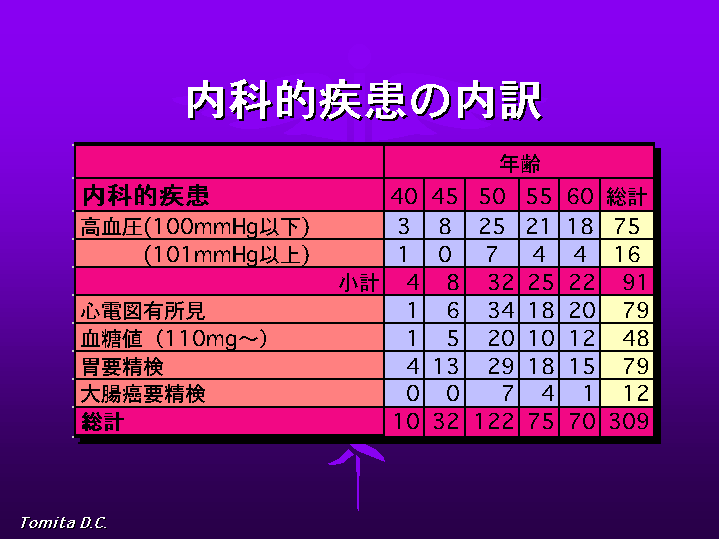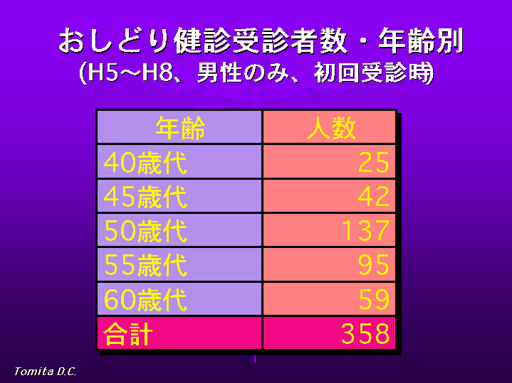 おしどり健診とは、配偶者と供にペアで行われる、歯科健診を含む人間ドッグで、40才から45才、50才、の節目と50才以上は毎年行われるもののうち、重複者を除いた、平成5年から8年までの4年間の初回受診分の男性358名について調べました。