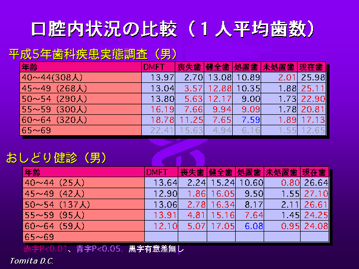 図2は、おしどり健診受診者のう蝕の状況を示してあります。う蝕の状況は上の平成5年歯科疾患実態調査と比較し、40歳代では、あまり差は見られ ませんが、年齢が増す毎に、おしどり健診者の方が口腔内状況は良く、現在歯では40才で両方とも約26本で差は有りませんが、50才で22.9本に対しお しどり健診では26.6本、60才で17.1本に対し24.1本であり、健保組合員のう蝕に関する口腔内状況は良好であると言えます。各項目、赤は危険率 1%、青は5%で有意差が認められました。