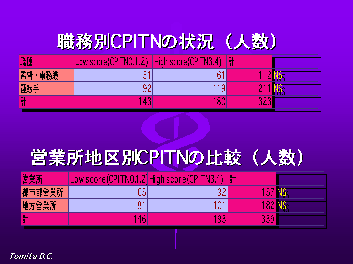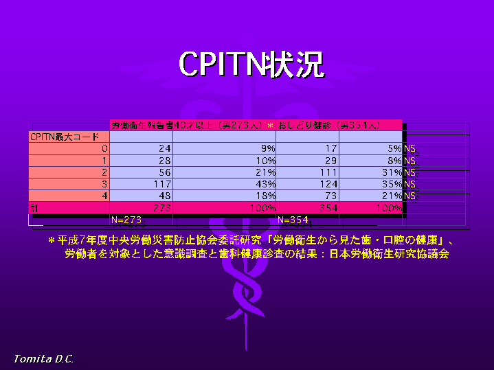 図3はCPITN最大コードの集計です。日本労働衛生研究協議会が全国的に各層の労働者を調査した資料中のCPITNの状況と比較しましたが、おしどり健診との差はみられませんでした。