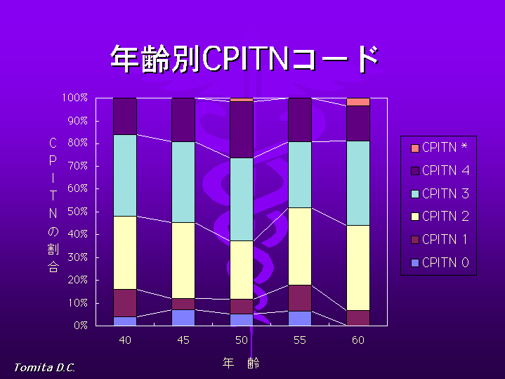年齢別CPITNコードの内訳は図4のとおりで、50才代でコード3、4がやや多くなっていますが、年代間における統計学的差は有りませんでし た。このことは、健保組合員の歯周病は、40歳以降の歯周病の進行は比較的よく管理されている反面、すでに40歳以前よりの歯周病がみられ、入社早期より の対策が示唆されます。