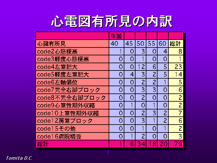 図5ははおしどり健診者の一般所見のうち、内科的疾患の内訳を示したもので、高血圧が最も多く91例、ついで心電図有所見と胃要精検が79例でし た。心電図所見の詳細は図6のとおりですが、歯周疾患等炎症性疾患との関連が疑われている虚血性心疾患や、高血圧による変化が含まれています。