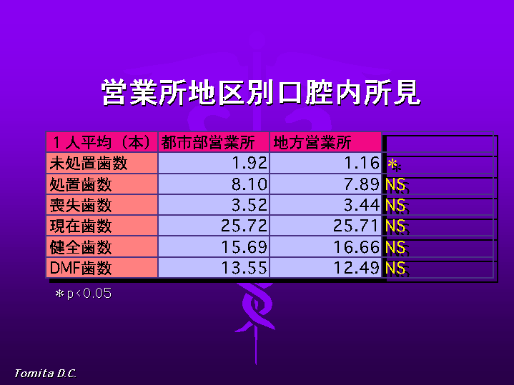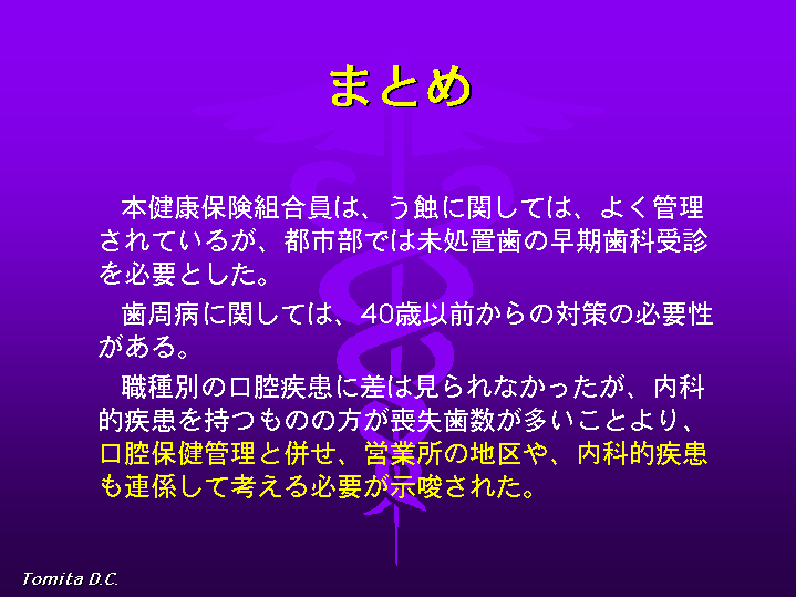 以上、本健康保険組合員は、う蝕に関しては、よく管理されていますが、都市部では早期歯科受診を必要とし、歯周病に関しては40歳以前からの対策 の必要性が示唆されました。また、職務別の口腔疾患に差は見られませんでしたが、内科的疾患を持つものの方が喪失歯数が多いことより、口腔保健管理と併せ 内科的健康管理も連係して考える必要が有ると思われます。